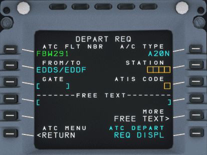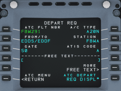 The DEPART REQ page requires the current ATC station code and the current ATIS. Providing a gate and freetext is optional.