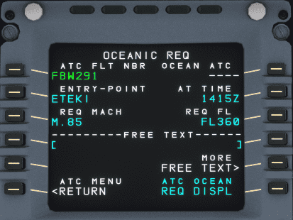 The OCEANIC REQ page requires you to be on the last station before an oceanic route. You need to enter your planned entry point, time at entry point, speed, and flight level.